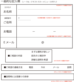 テキストフォームでは自由に書けるメリットとの反面、間違えた商品名で記入されたり、はい/いいえの二択で求めてる項目に曖昧なグレーな記入をされたりすることもあります。そのような場合にはドロップダウンメニューやボタンにして、予め設定してある項目しか選択できないようにすると便利です。商品名やサービス名はドロップダウンメニューで。「資料は:必要/不要」など二択の項目はラジオボタンで。「週末の過ごし方:ドライブ/読書/釣り/キャンプ/映画」などのように複数選択可の場合はチェックボックスにすると大変便利です。