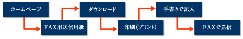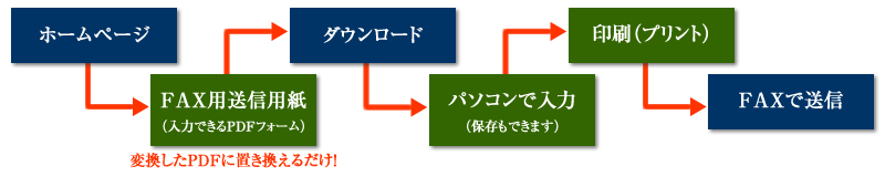 つまり。お店や会社のホームページにPDFのFAX送信用紙を掲載していて、自由にダウンロードできて、利用者は、その送信用紙をパソコンで開いてプリンターで印刷して、必要な箇所は手書きで記入して、FAXで送信をする。またお店は、受信してそれを処理する。